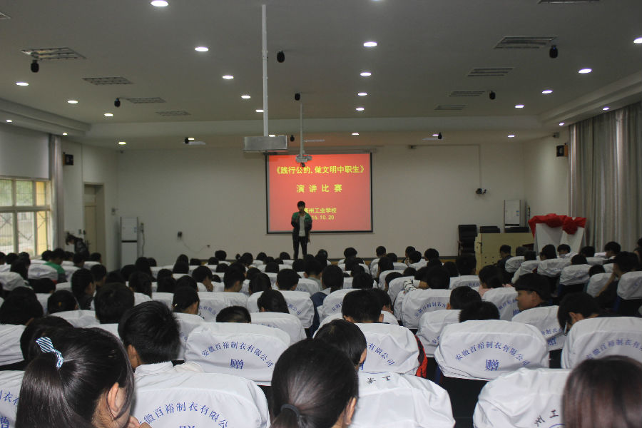 为了培养学生养成良好的思想品质和行为习惯,更为进一步落实《中等职业学校学生公约》,10月20日下午,亳州工业学校在多媒体会议室举行“践行公约,做文明中职生”主题演讲比赛。担任本次活动的评委嘉宾有学生处主任李兴华以及韩亚南、邢文娜等八位老师。来自2015和2016级的二百多名学生观看了此次演讲比赛,比赛在同学们的热烈掌声中拉开了帷幕。
