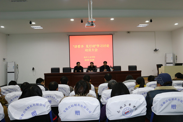 12月5日下午,亳州工业学校举办“讲看齐,见行动”学习讨论动员大会。该校党支部书记、校长孙结红及全体党员参加会议。副书记李兴华主持会议。