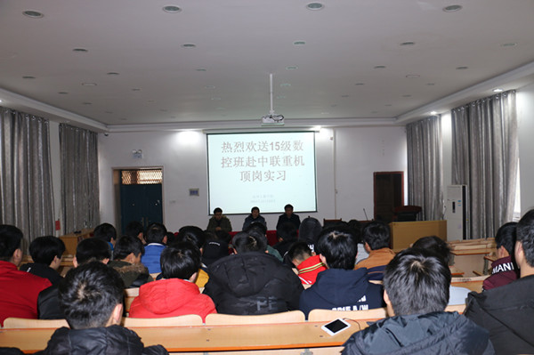 12月19日,亳州工业学校召开专题会议欢送2015级数控专业学生赴中联重机集团亳州有限公司顶岗实习,校长助理崔居杰、招生就业办主任邹新力、数控部主任雒锐参加会议。