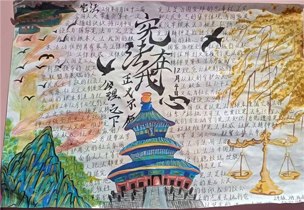此外,学校还组织开展了以“国家宪法日”为主题的手抄报创作活动。学生们踊跃参与,精心设计,用画笔和文字描绘自己对宪法的理解与感悟,一幅幅主题突出、图文并茂的手抄报,成为校园内一道独特的法治文化风景线,进一步营造了浓厚的宪法学习氛围。