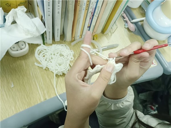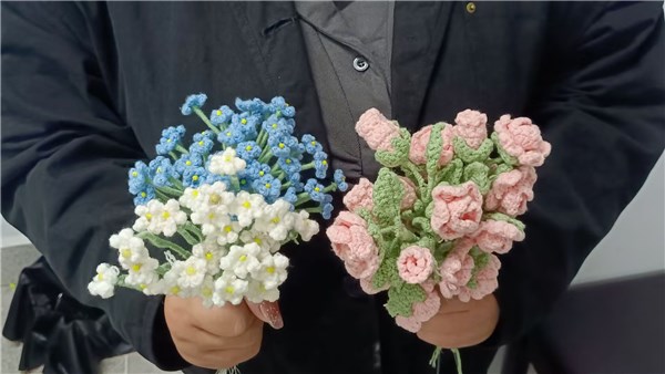 课堂上,同学们在老师的悉心指导下,从基础的起针、绕线,到复杂的花瓣、花叶钩织,一丝不苟,神情专注。一根根普通的毛线在她们灵巧的手中渐渐成型,变成了一朵朵栩栩如生、色彩鲜艳的玫瑰、康乃馨等。大家互相交流技巧,分享心得。