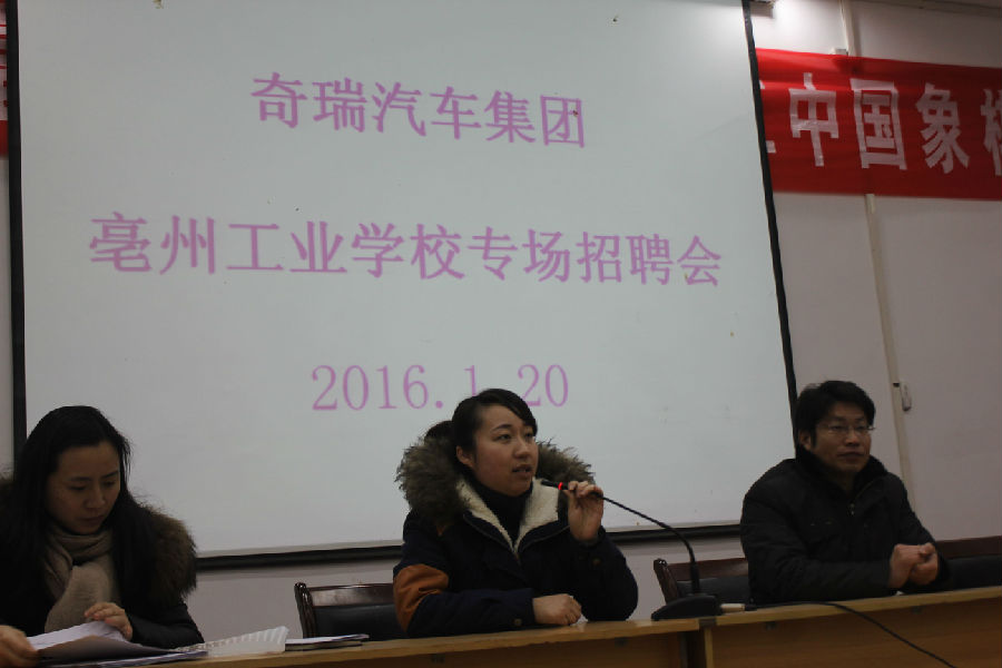2016年1月20日上午,亳州工业学校2014级的学子们,迎来了寒冬里的希望,因为奇瑞汽车集团在我校召开了大型的专场招聘会,这意味着他们的未来有了着落。