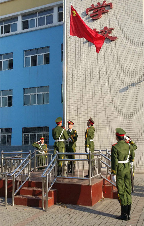 清晨7点30分,校园内一支身穿军装的队伍,在清脆的口令指挥下,迈着正步行进到旗杆前。随着一声洪亮的“敬礼”口令,升旗手拉动滑轮,擎旗手挥动右手,划出一道美丽的弧线。鲜艳的五星红旗沿着高高的银色旗杆冉冉升起……