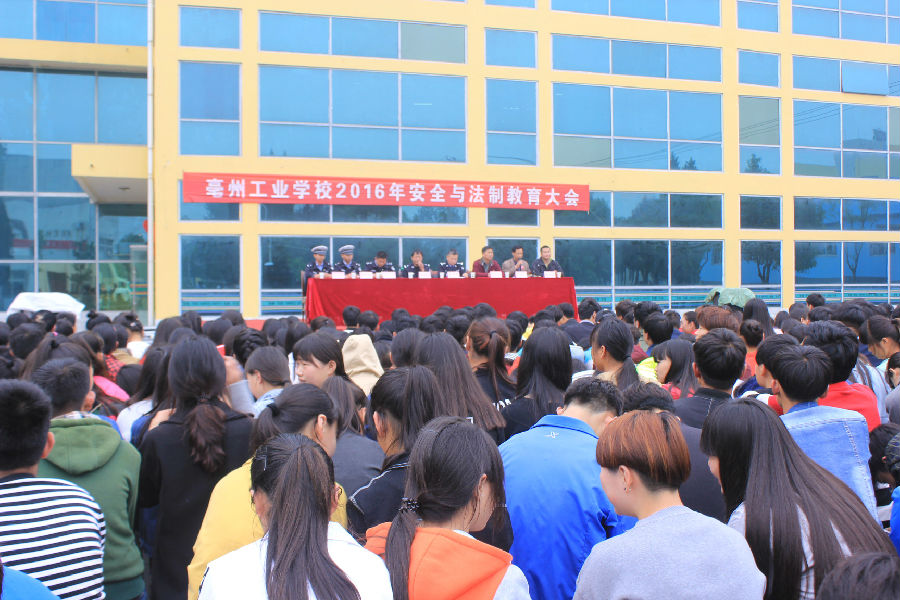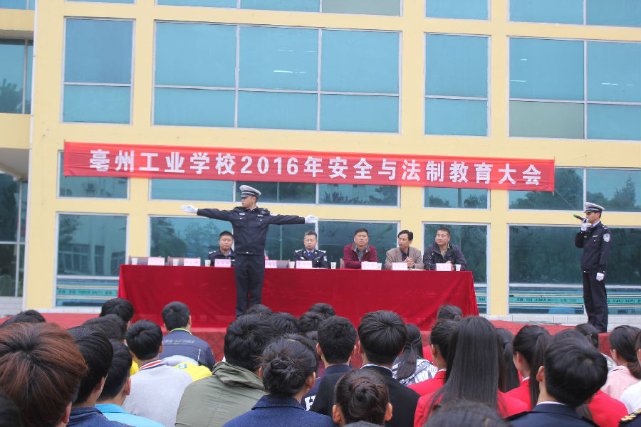 4月20日下午,亳州工业学校学校举办了2016年安全与法制报告会,邀请到亳州公安局开发区分局李洪林警官为同学们作专题法制教育讲座,市交警大队杨彦坤警官做了安全教育报告,李坤、马晓峰警官做了交通安全手势示范表演,以进一步增强学生的法制观念,提高应对安全问题的能力,促进平安校园、文明校园建设。